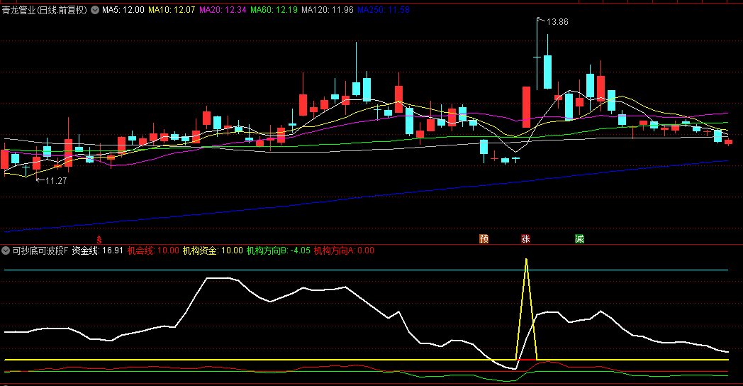 2.波段机会:当黄色"机构资金"线上穿红色虚线且红柱"机构方向A"放大时,提示趋势性机会