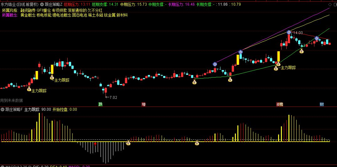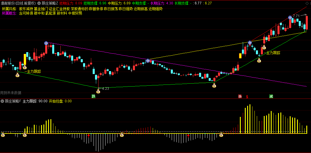 主图通过彩色线段直观标记个股的短期/中期/长期压力与支撑位:红色为短期压力,绿色为支撑,黄线与紫线分别对应中、长期压力。当出现黄色"主力跟踪"信号且伴随底部箭头时,提示主力资金介入机会。涨停个股以红黄柱状高亮显示,帮助捕捉强势股。
