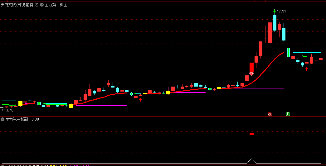 紫色/青色线分别标记趋势强弱分界点,红色粗线为多头信号,绿色粗线提示风险。