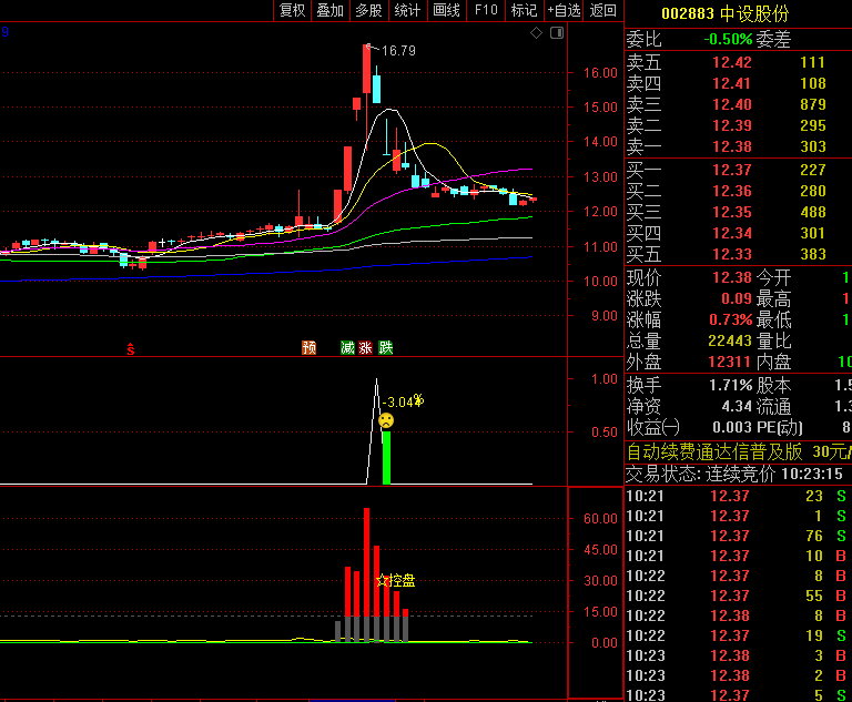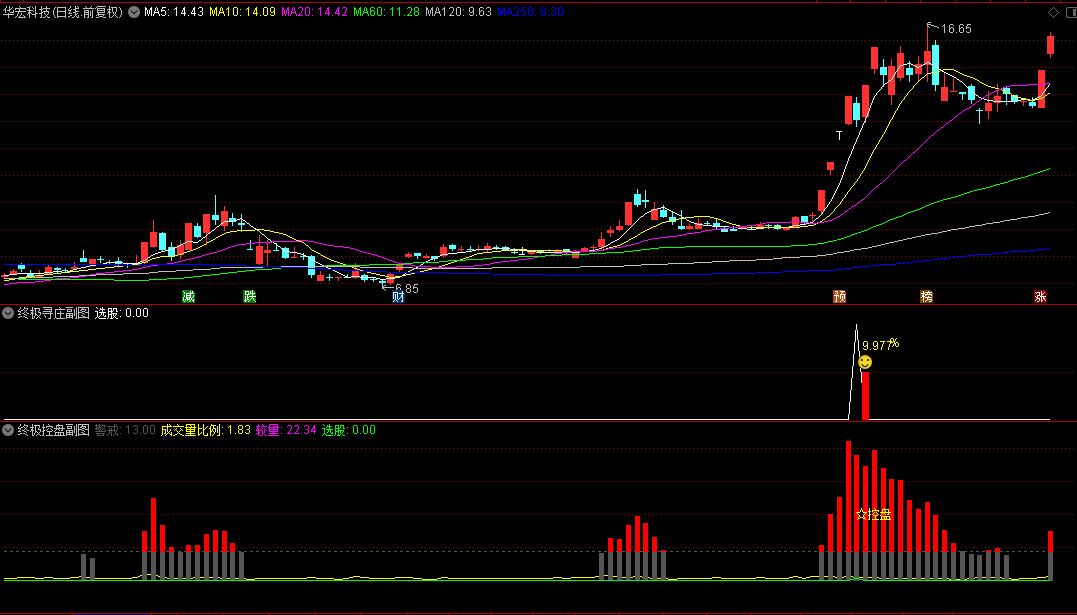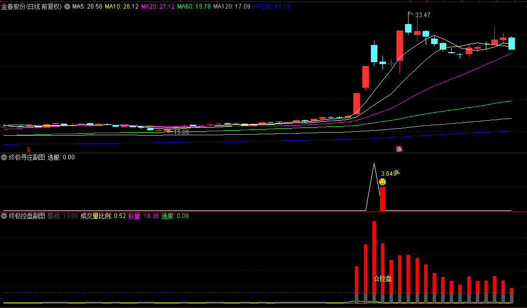 副图指标:观察红色柱状线是否持续高于13,同时关注"☆控盘"文字提示;