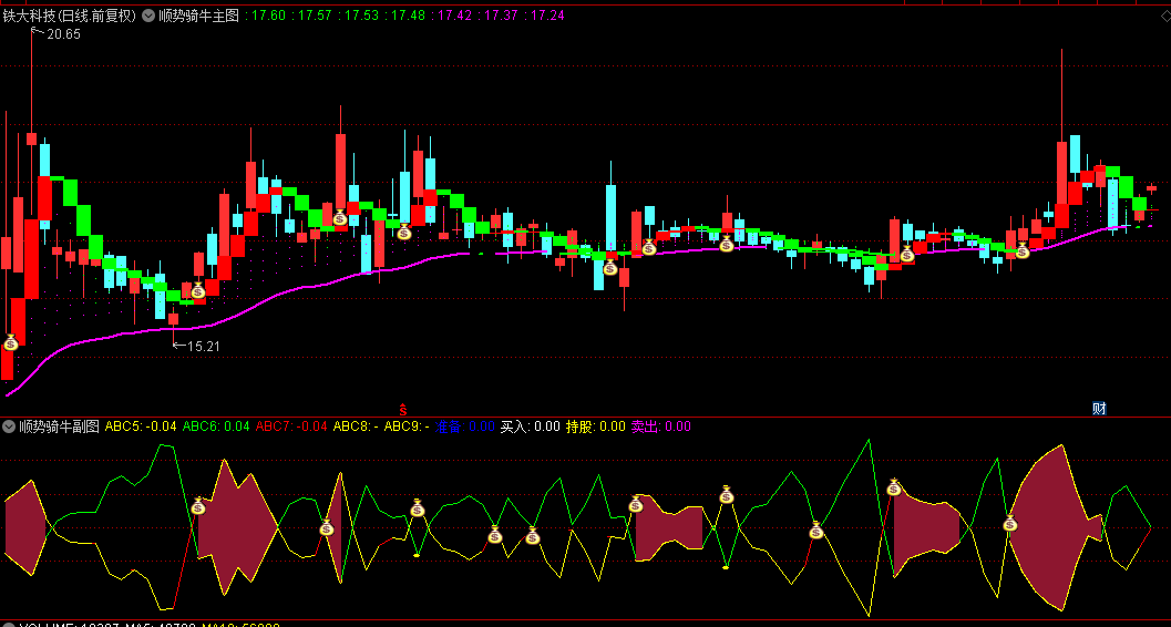 主图指标:通过7组不同周期的均线组合判断趋势方向。当彩色点状线呈紫红色并向上发散时,表明处于上升趋势;绿色点状线则提示下跌趋势。最粗的紫红/绿色线为长期趋势核心,结合柱状线颜色(红涨绿跌)可直观识别多空转换。出现"牛头"图标时,代表符合"顺势骑牛"买入条件。