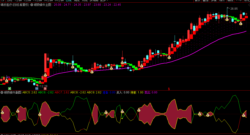 【顺势骑牛】主图/副图/选股指标,主图定方向,副图定买卖点,选股器中短线批量捕捉机会!