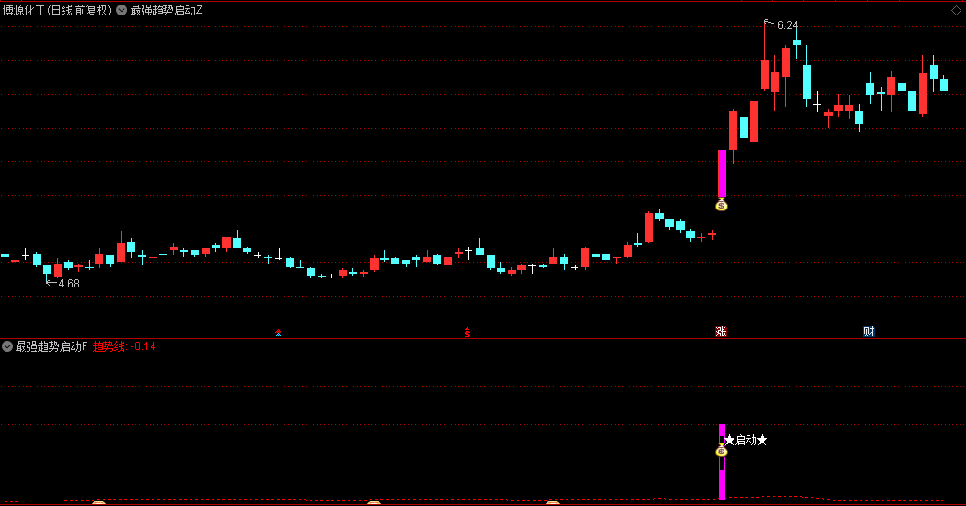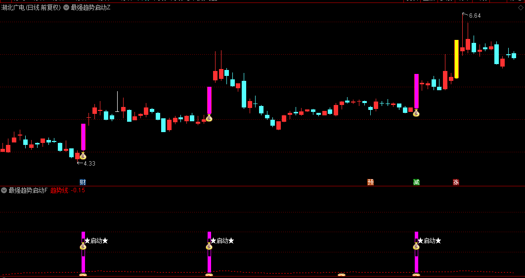 3.趋势反转信号(紫色柱+启动提示):紫色柱状图配合"★启动★"标记时,反映股价经过调整后重新进入上升通道。
