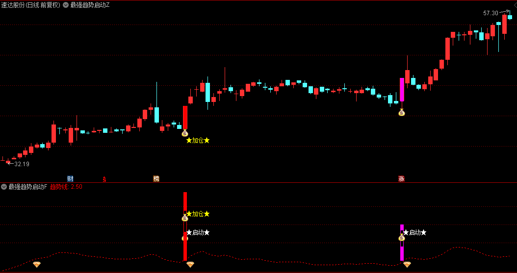 2.强势拉升信号(红色柱+加仓提示):出现红色柱状图及"★加仓★"文字时,表明个股放量突破关键压力位,符合追涨条件。