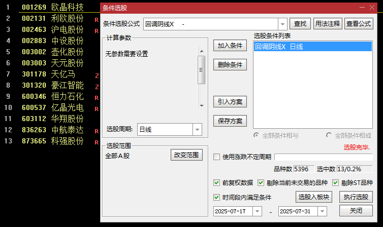 选股功能:通过条件“千千厥歌=1”筛选符合条件的个股,排除创业板(300)、科创板(688)及ST股票。