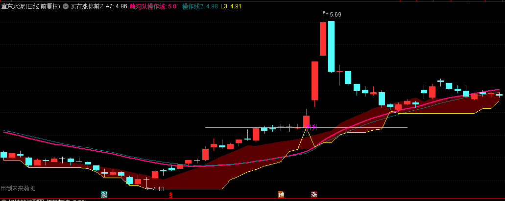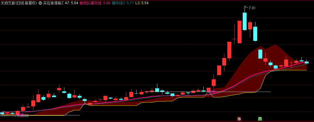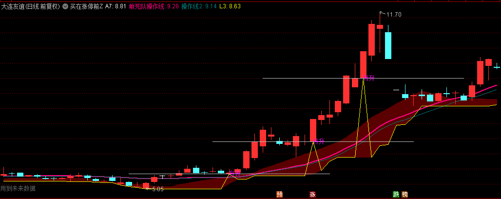 当主图出现黄色标记“升升”时,表示股价可能即将启动涨停,结合紫色“敢死队操作线”与青色“操作线2”的金叉确认趋势。