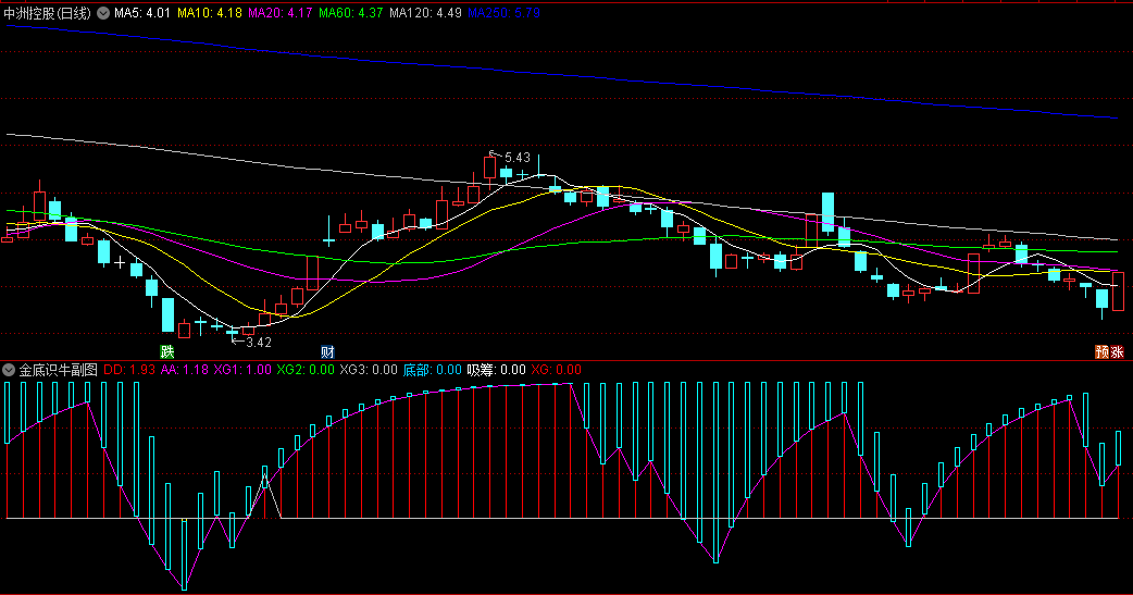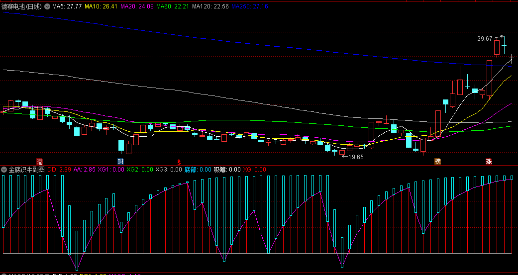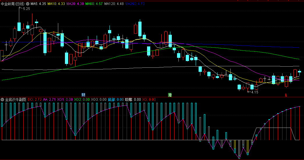 “金底识牛”副图指标是一款比较常见的底部反弹指标,当下跌到一定程度时,就能激发反弹力量,黄柱扎堆出现,反弹意愿强,由长变短开始关注,结合指标中的红钻信号或黄柱消失当天来确定入场。