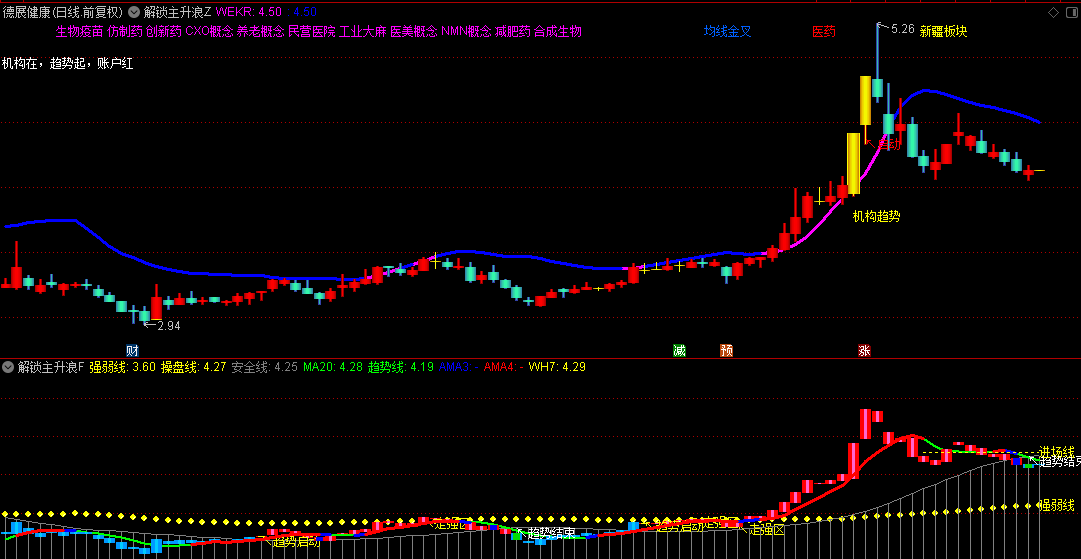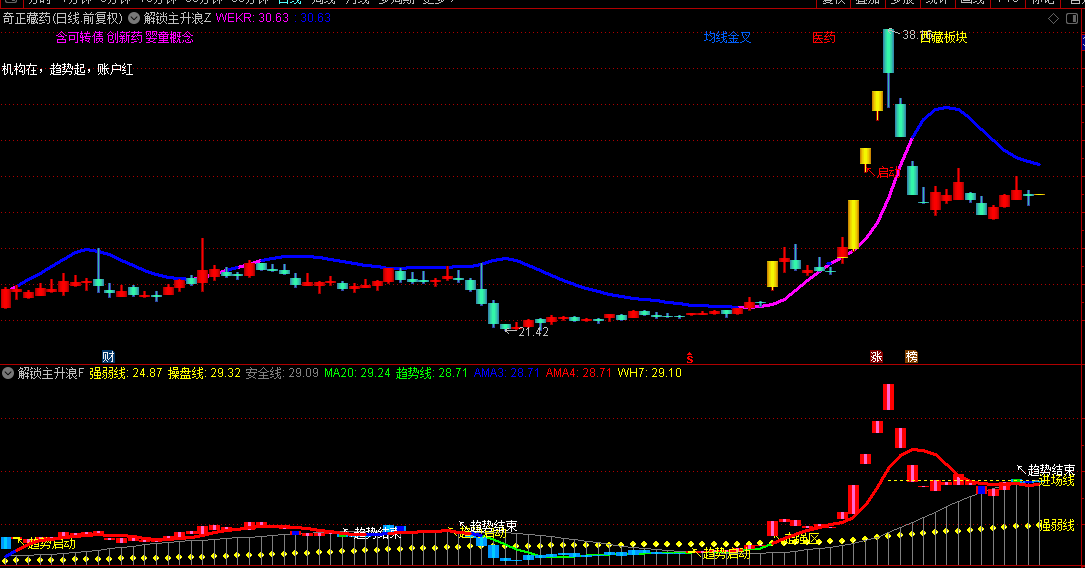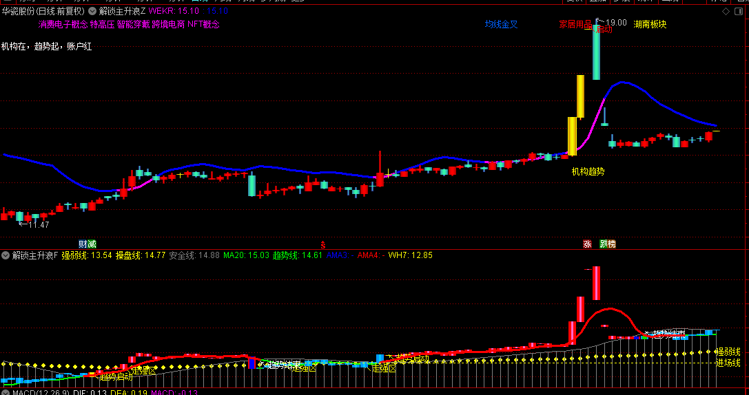 通过紫红色/蓝色趋势线动态显示多空分界:股价上穿紫红趋势线(WEKR线)时进入强势区,反之为调整阶段。