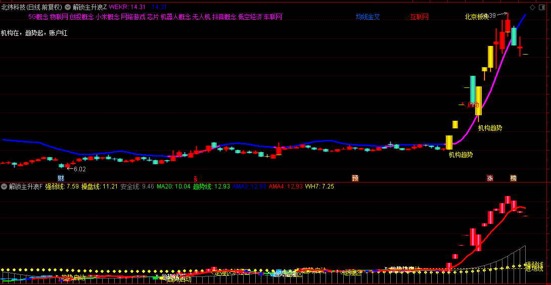 黄色"机构趋势"信号结合放量突破提示主力介入机会,绿色柱状标记跌停风险。适用于捕捉个股主升浪启动点,