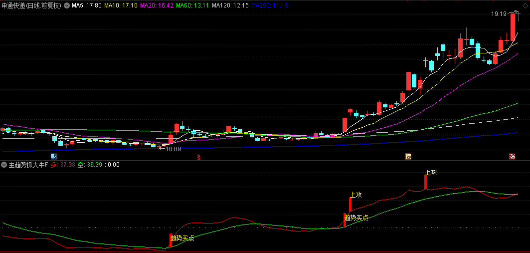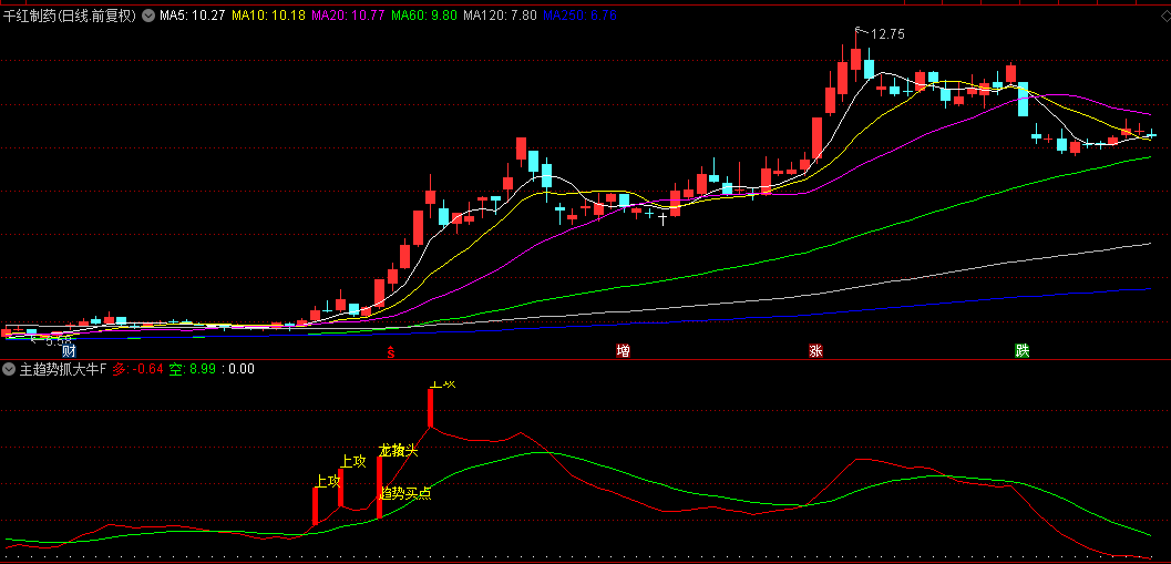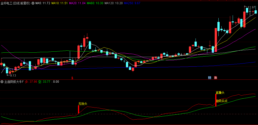 加载至副图区域后,关注红色“多”线上穿绿色“空”线形成的金叉,配合“龙抬头”“上攻”等文字提示及红色柱状信号出现时,可作为趋势启动参考。