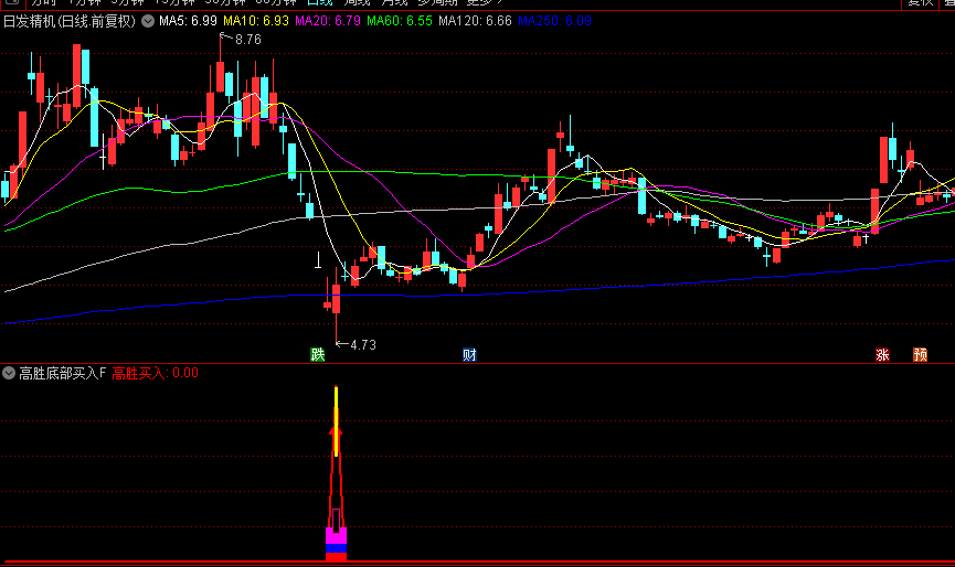 副图区域会出现彩色柱状信号与文字提示:当紫色与黄色柱状组合出现,并伴随“★准备”字样时,表明底部条件初步满足;若出现红色信号柱与“★发射”提示,则确认买入时机。此时需结合K线位置观察,股价需处于40日均线下方超跌状态(收盘价低于40日均线26%以上),且近期出现明显放量波动。该指标不含未来函数!