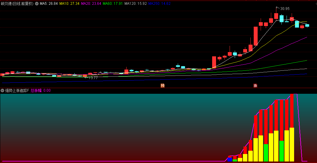 1.通过紫色柱状线直观显示强势信号起始点,柱体高度代表波段累计涨幅强度