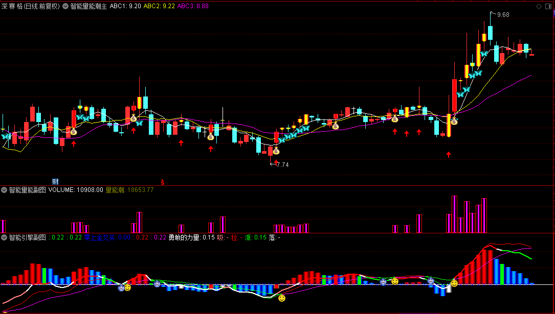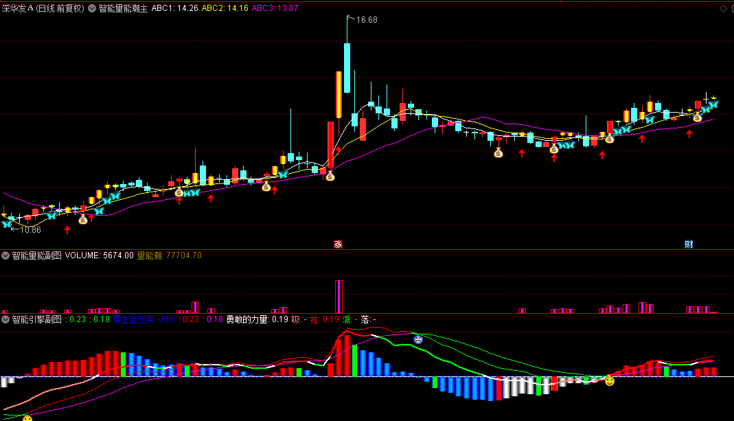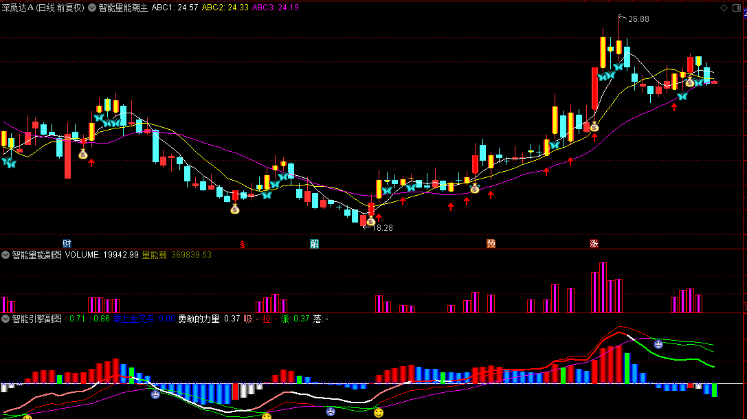 黄色柱线出现代表量能潮与价格同步走强,是短期多头信号。连续出现多个“好点标志”图标时,表明上涨动能持续。结合MACD金叉及J线交叉可强化买入判断。