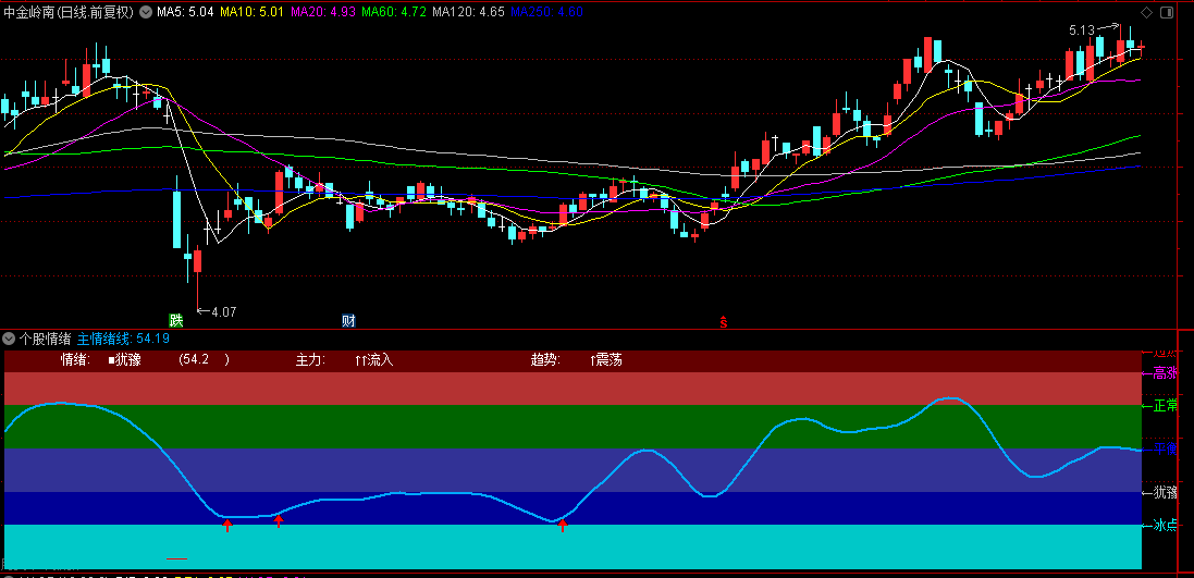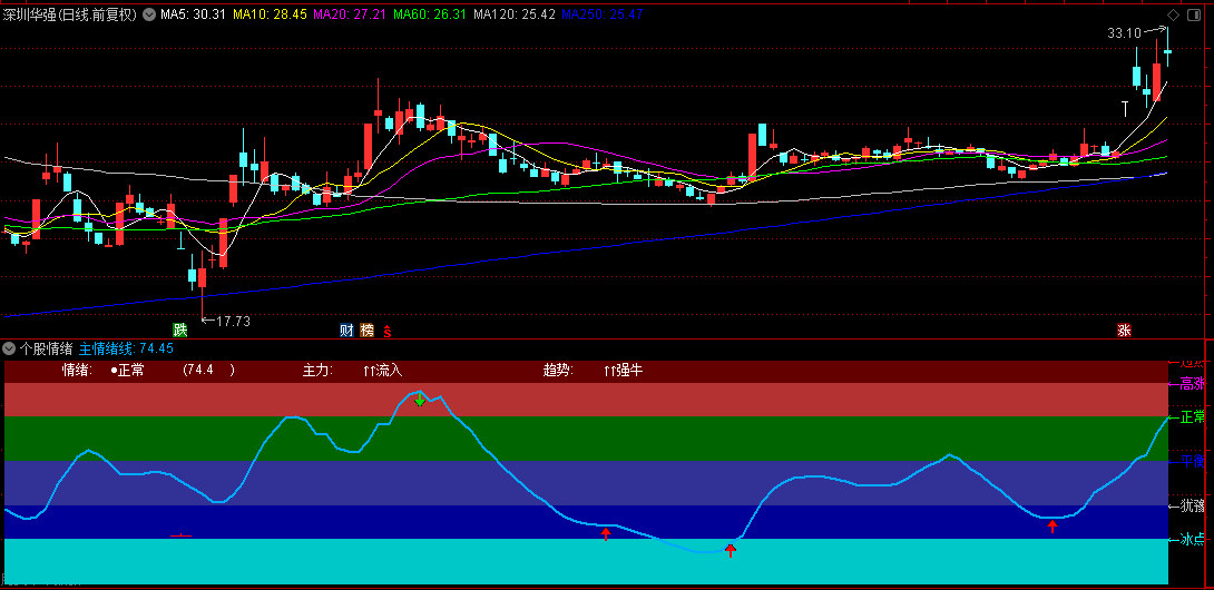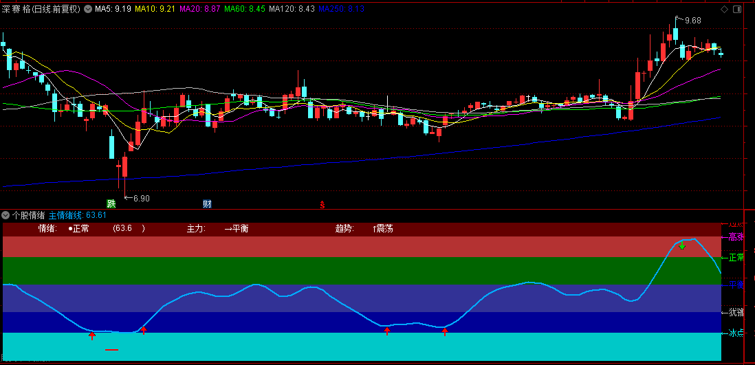 用法:情绪指标会更多时间停留在正常(55-75)和高涨(75-90)区域。应持股为主,不要因为指标进入高涨区就轻易卖出,以免错失主升浪,