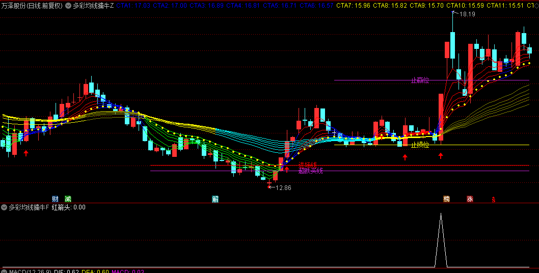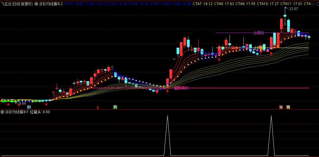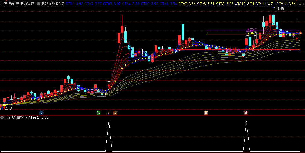 直接加载至主图,系统自动显示多组彩色均线及关键信号。蓝色均线代表短期趋势,黄色为中长期趋势。当短期均线呈多头排列并显示为红色时,为强势上涨信号;绿色则提示短期走弱。紫色箭头标识为短线买入点。同时指标自动绘制“进场线”“超跌买线”辅助判断支撑,并结合“止损位”“止赢位”明确风控位置。