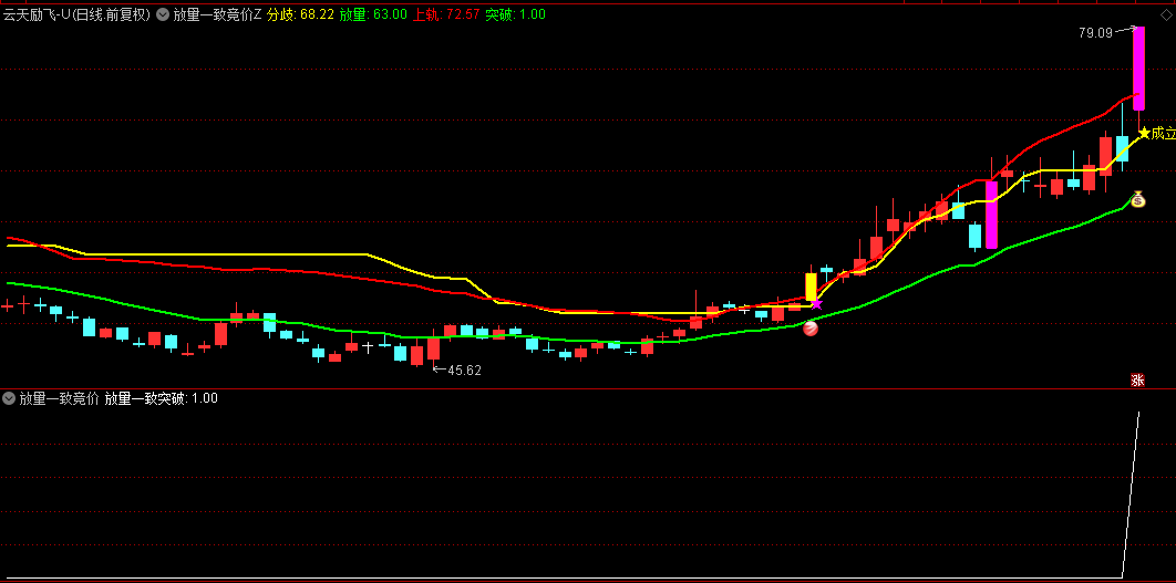 本指标用于识别股票在竞价阶段或盘中出现的放量突破信号,辅助判断短期强势启动点。适用于捕捉个股在放量配合下突破关键价位的买入机会,尤其适合追踪短线强势股和趋势加速行情。