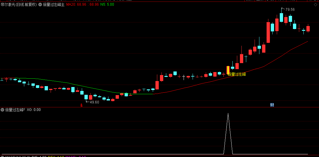 在股价经过洗盘后,前高是特别大的阻力位,如果主力还愿意放倍量突然前高左峰,代表主力势在必得的决心。如果是倍量+涨停过左峰则更佳。正所谓“倍量过左峰,涨停急先锋,涨停过左峰,后市有一冲”。如果股价位置越低,倍量过左峰后期升幅越高。