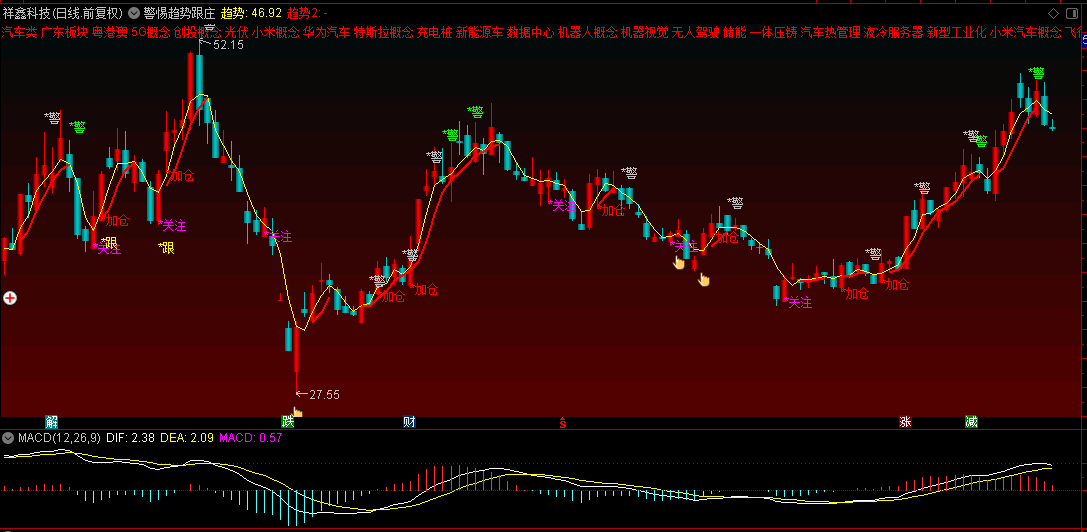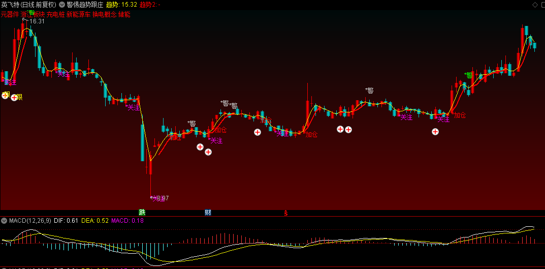 出现“警”提示时表示可能见顶,需警惕回调风险;“关注”提示超卖反弹机会;“加仓”提示趋势启动信号;“跟”提示中期趋势向好。