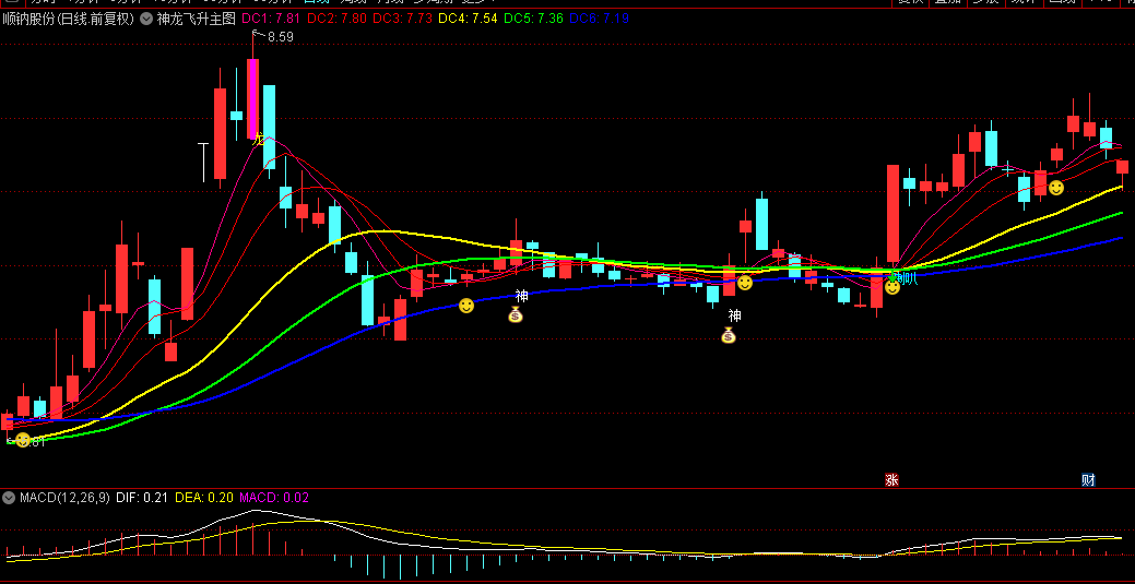 神龙飞升指标是一款综合趋势与动量分析的多功能主图工具,旨在辅助投资者识别强势启动信号、趋势转折点及波段机会。其核心通过加权均线、MACD动量及波动通道组合,标记“神飞”“叠彩”“喇叭”等策略信号,适用于短线博弈和中线趋势跟踪。