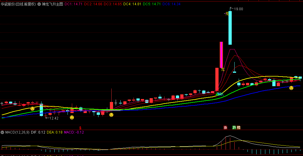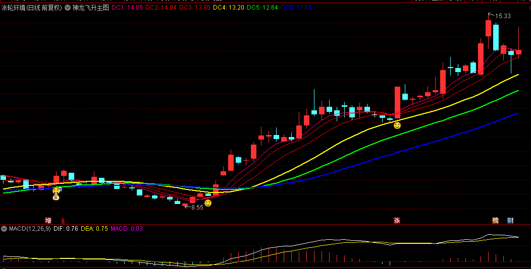 黄线(DC4)上穿蓝线(DC6)为中期多头趋势,绿线(DC5)支撑作用较强;