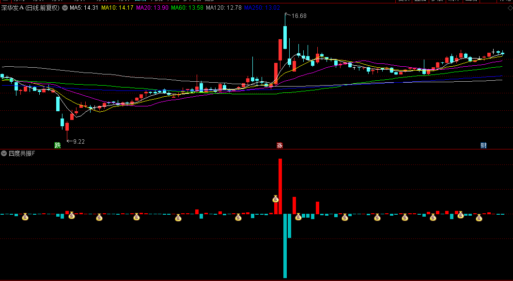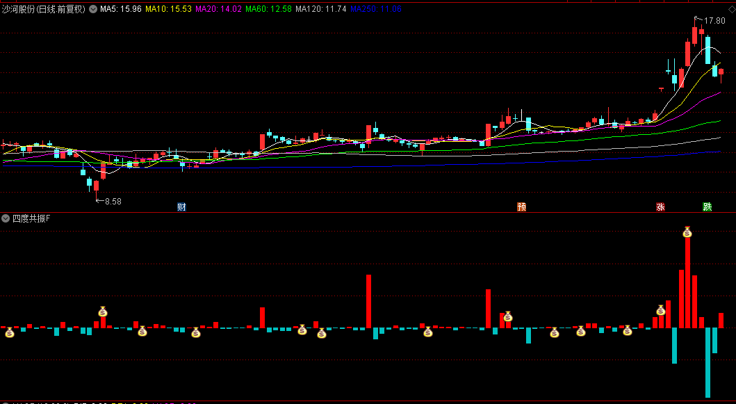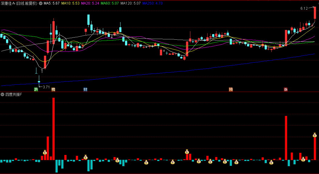 当指标出现连续两根红色柱且伴随向上的箭头信号时(称为“四度共振”),表明市场可能形成短期买入机会。投资者可结合其他技术指标(如均线、成交量)进行确认,在共振信号出现后寻找入场点。该信号特别适用于震荡行情中的转折点判断。