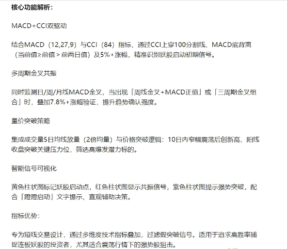 专门为短线交易者设计的交易策略,能通过多维度技术指标叠加参考操作,过滤掉虚假突破信号。适用于激进投资者。追求高胜率捕捉连扳妖股的投资者,尤其是适合震荡行情下的强势股的跟踪操作。