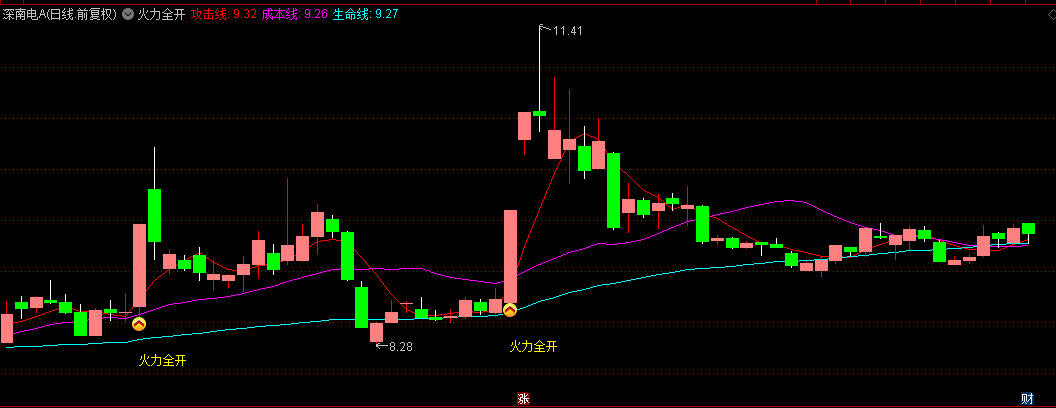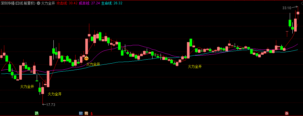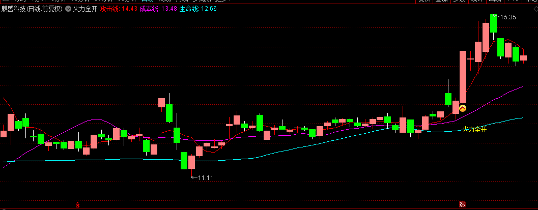 2. 启动信号:当所有均线斜率同步向上且出现特定K线形态时,在低位标注“火力全开”黄色文字及图标提示;