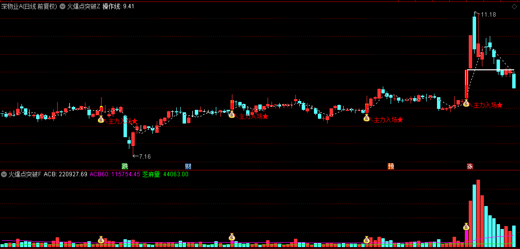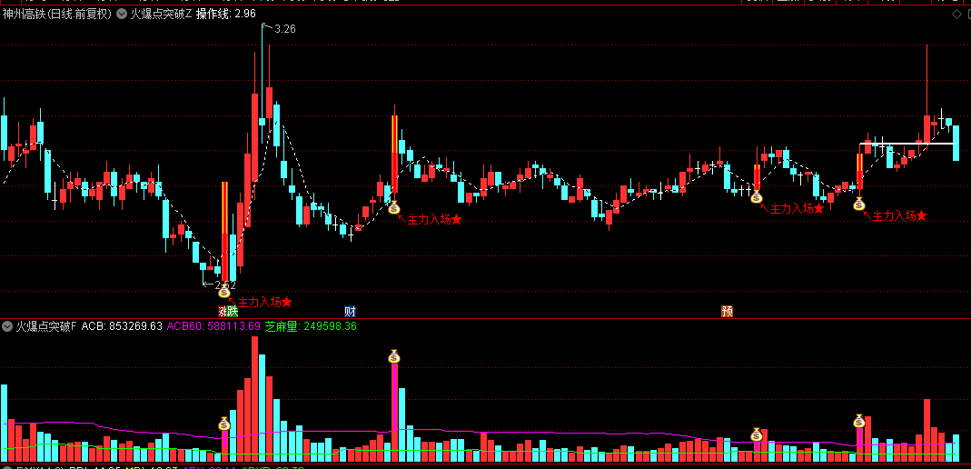 在主图中,当出现黄色柱状叠加红色K线,并伴随“主力入场”文字提示及箭头标识时,表示当日成交量骤增3倍以上、股价收阳且站上5日均线,为短期强势突破信号,可关注介入机会。
