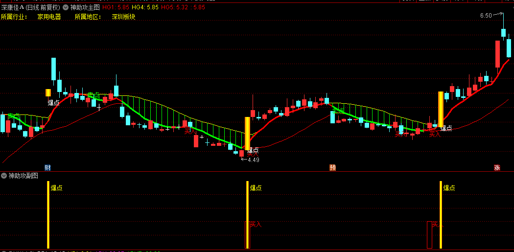 主图指标:直接显示于K线图中,通过红色/绿色粗线直观反映趋势强度。当出现“买入”信号且K线突破压力线时,为多头启动信号;“卖点”提示则建议警惕回调。蓝色“爆点”标记结合涨停形态,提示强势突破机会。