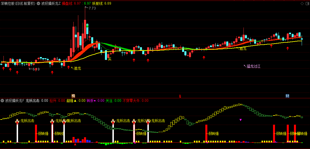 幅图指标系统是一个功能强大的综合性技术分析工具,集成了趋势强度分析、多空动能可视化、精准买卖点提示、风险预警等功能。它通过多种算法从不同维度捕捉市场机会,特别擅长识别强势启动点(龙妖出击)、弱势转强点(弱转强)、超跌关注点以及顶部风险点。