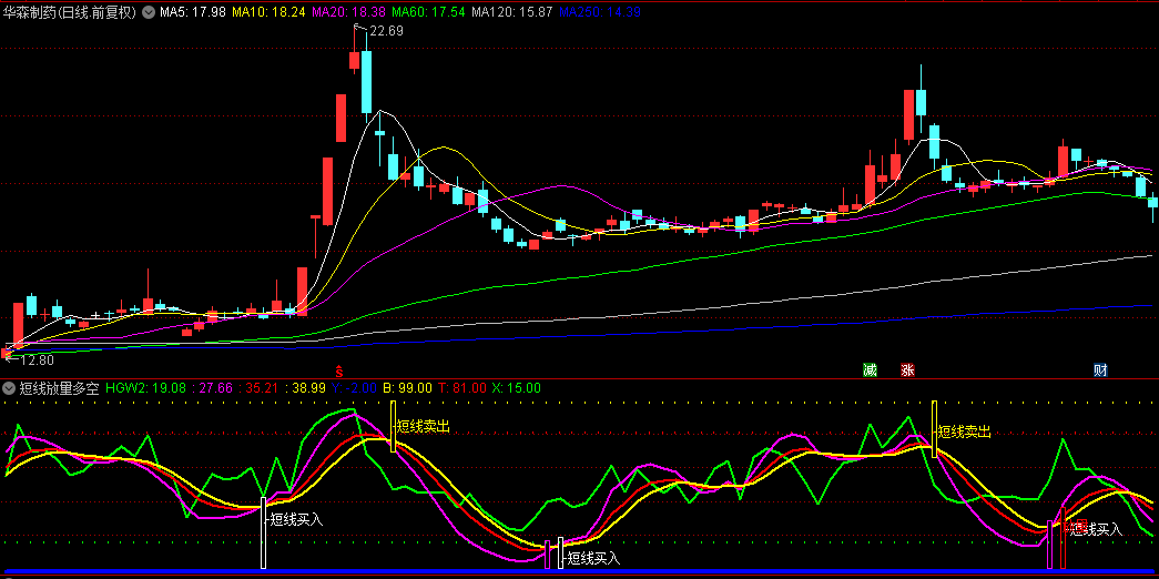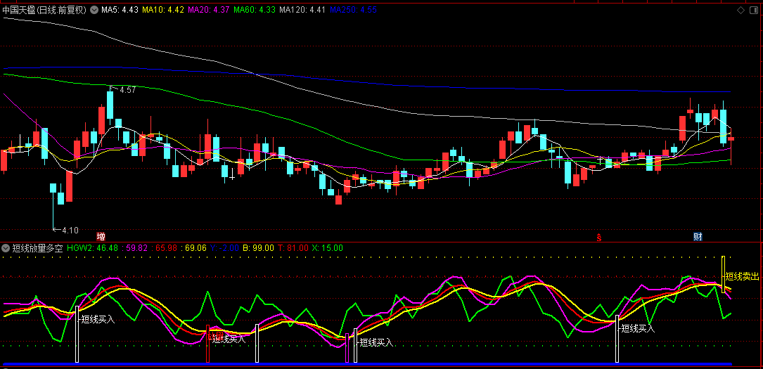 指标通过三条核心线(红、粉、黄)动态显示价格强弱区间,结合量能变化捕捉机会。当出现“短线买入”文字提示且伴随白色信号柱时,表明短期走势转强,可考虑介入;若出现“放量”红柱信号,代表量价齐升,是多头确认信号。相反,出现“短线卖出”提示及黄色信号柱时,提示短期风险,宜减仓避险。