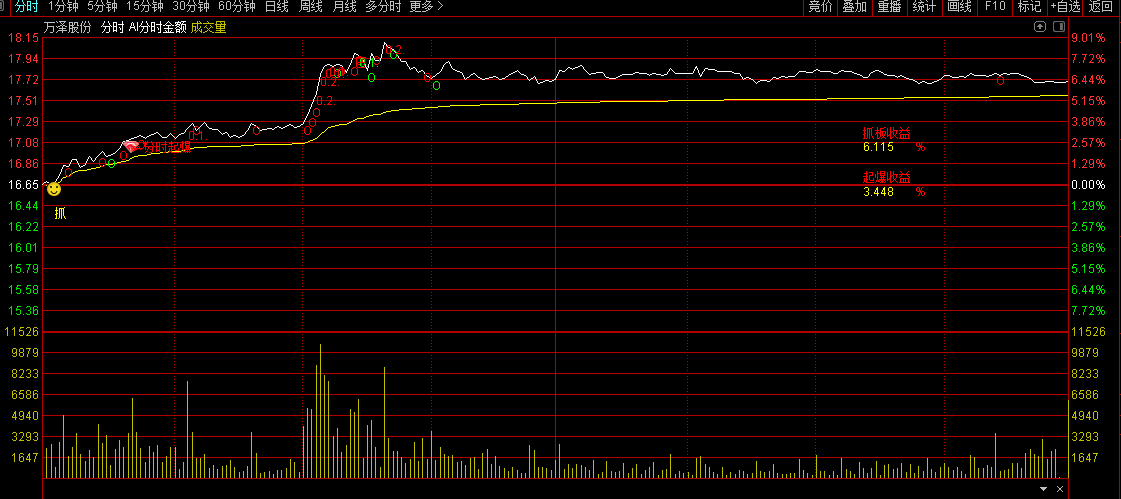 通达信【AI分时金额】主图指标,分时金额显示,适合看涨速榜抓板操作!