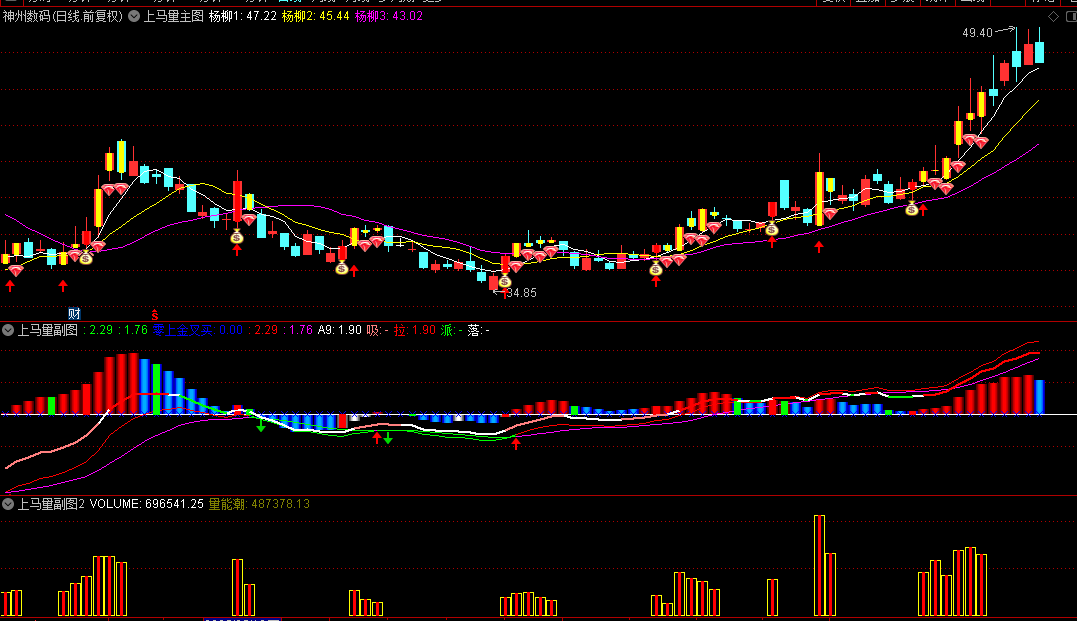 “上马量”是一款综合量价与趋势的多功能指标,适用于主图、副图及选股分析,主要用于捕捉个股启动信号和跟踪资金动向。不含未来函数!