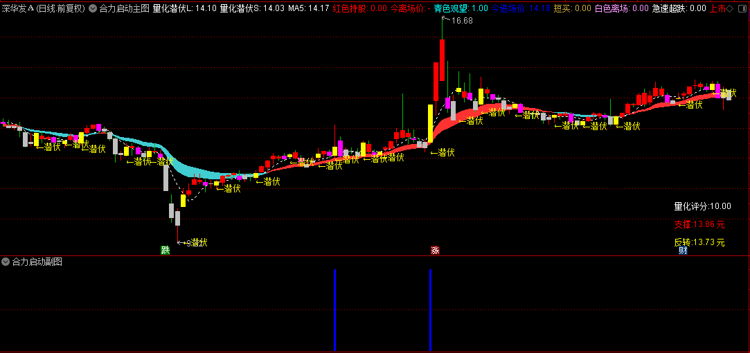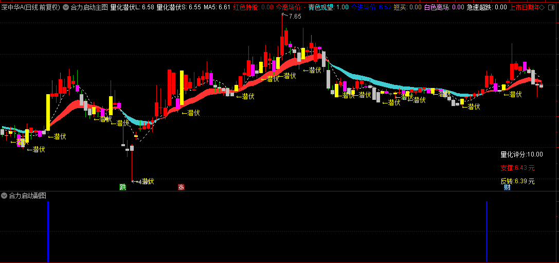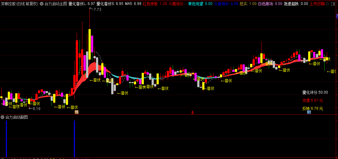 本指标系统包含主图与副图组合,用于识别个股趋势强度及资金合力动向。主图通过“量化潜伏”通道(彩色带状区域)判断多空态势:股价在通道上方运行且出现“红色持股”信号时,代表趋势向上,可持仓;若下破通道并触发“青色观望”信号,则建议谨慎。副图专注捕捉短线机会:“机游合力”红柱标记机构与游资共同推动的启动点,配合“★机游合力”文字提示,适用于追击强势突破行情。