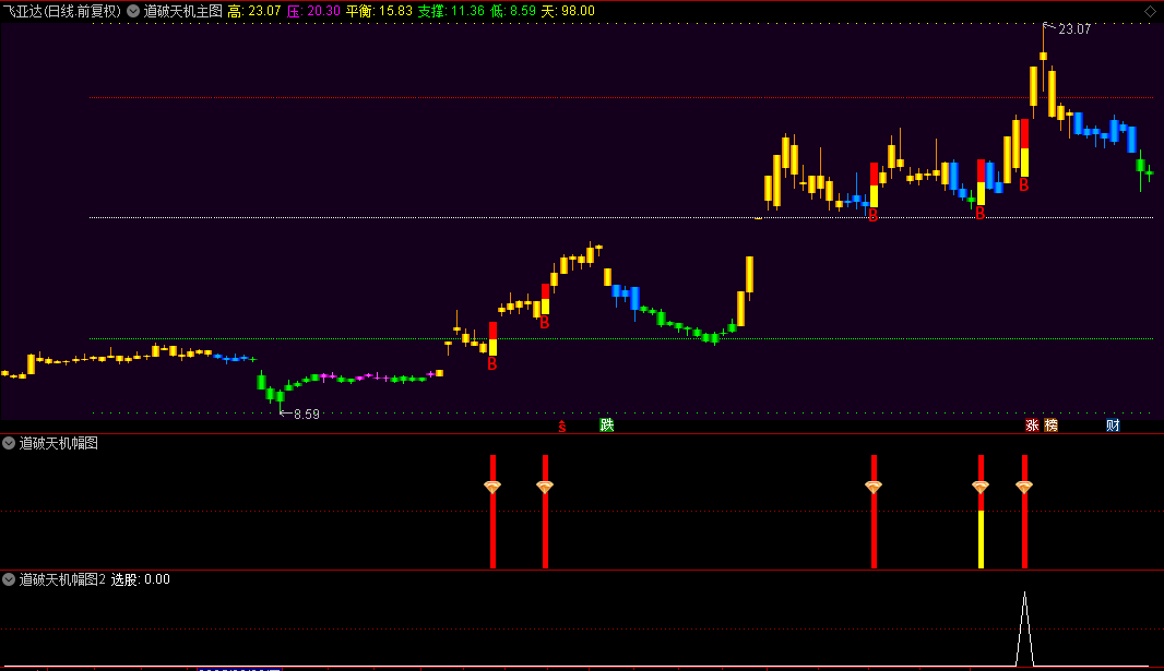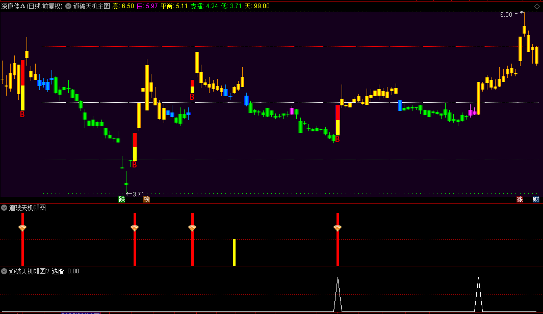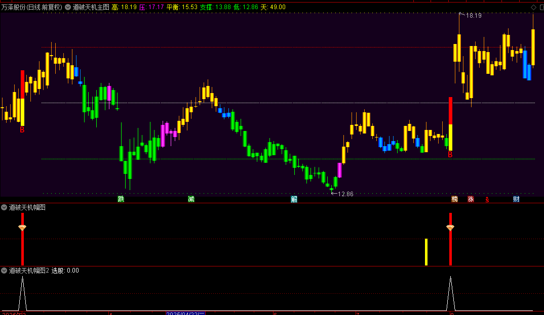 主图指标通过多维度分析市场状态,结合了价格通道、均线系统和动量指标,使用斐波那契比例划分价格区间,通过K线颜色变化直观显示趋势状态,提供明确的买入信号标记,适合中短线交易者使用,帮助交易者识别趋势方向、关键价位和潜在交易机会。