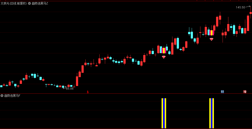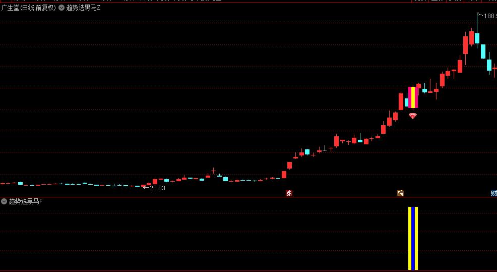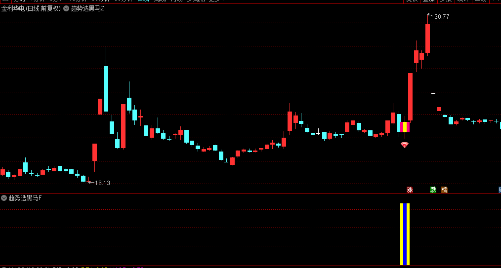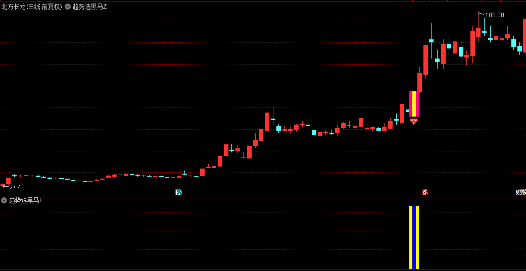 加载后K线图上会出现特殊彩色柱状标识,当出现洋红色与黄色叠加的柱体时,表示当前符合黑马启动条件,可结合均线趋势辅助判断买点。