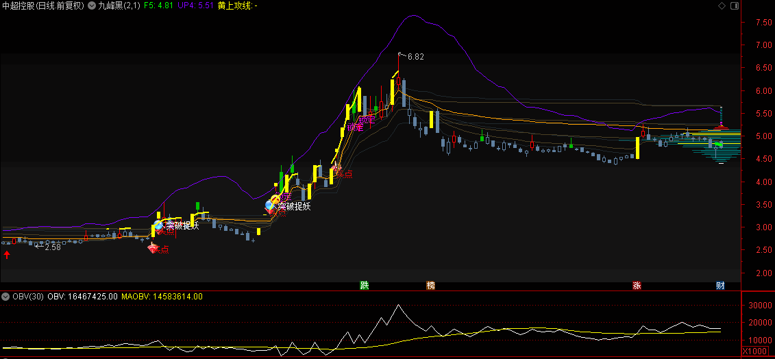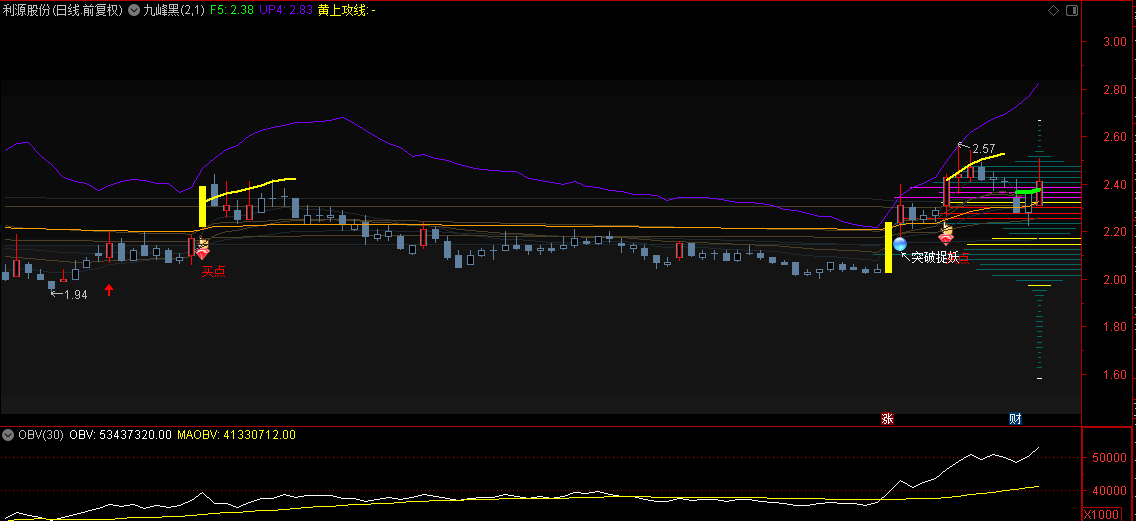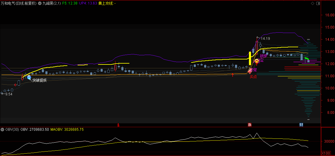 【九峰黑】主图指标 对于不同颜色筹码线,出现在不同的位置,可以预判股价所处于高低位置