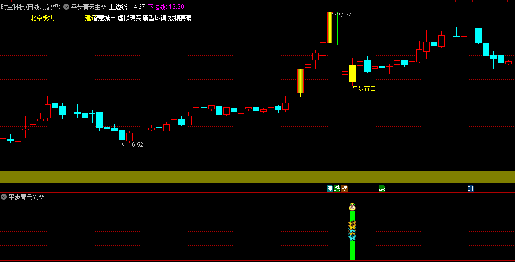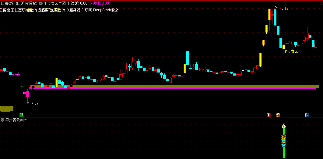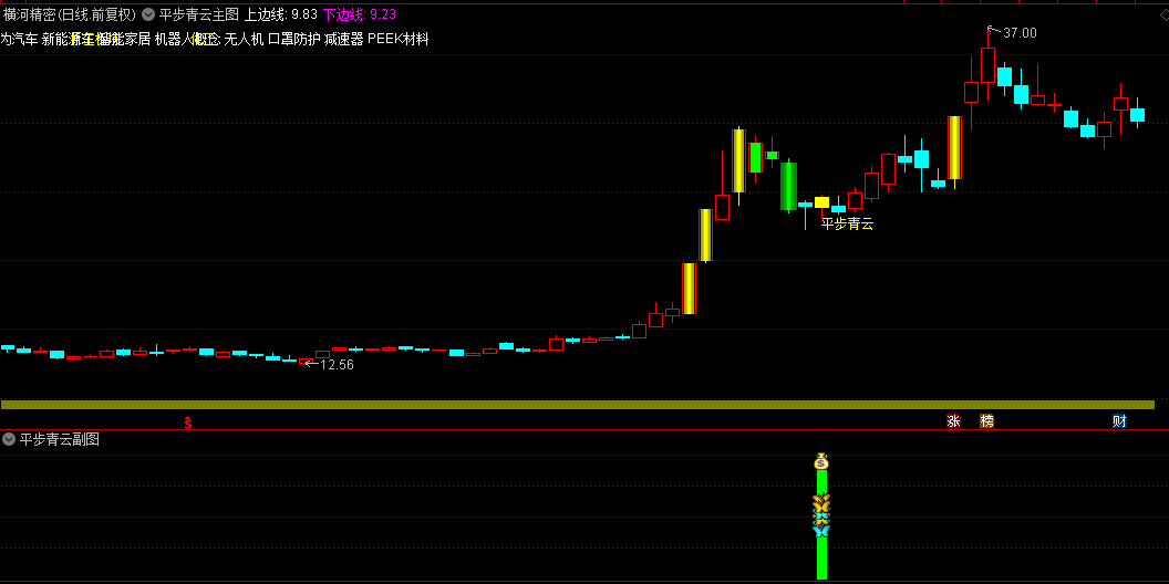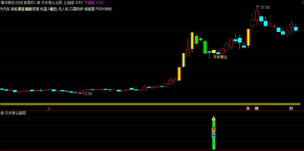 指标综合了趋势判断、超买超卖识别、成交量分析等多种维度,适合作为中短期交易的辅助分析工具,其中 "平步青云" 信号可作为潜在买入机会的参考。