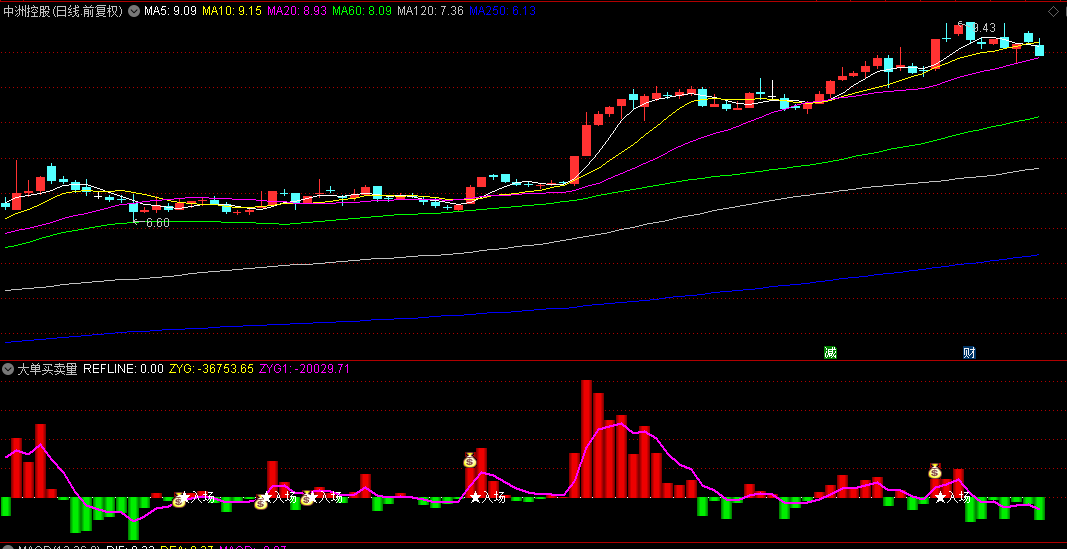 1.副图展示:将指标加载至副图区域,观察ZYG柱状图变化。蓝色柱表示大单净买入,绿色柱表示净卖出。