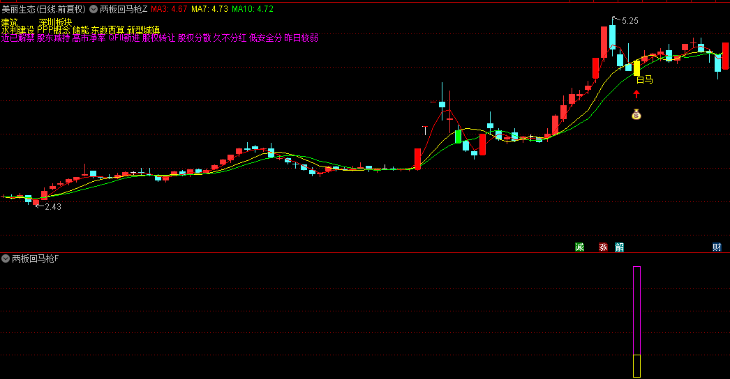 本指标适用于捕捉强势股回调后的反弹机会,主要用于短线操作。主图通过紫色和蓝色柱状线标记涨停与跌停,并以黄色柱体及“白马”文字提示潜在反弹信号,同时显示行业与地域板块信息。副图在出现“两板回马枪”信号时弹出magenta色带和黄色图标提示。选股公式可自动筛选符合连续涨停后回调企稳条件的个股。指标不含未来函数!