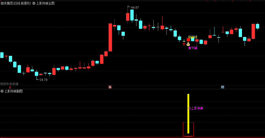 3.共振买点,精准进场:当主图的“突破”信号与副图的“上影突破”信号同时出现时,形成强烈的共振信号,这是趋势和量能的双重确认,是最可靠的买点。