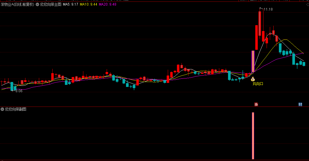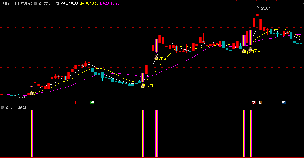 1. 主图/副图应用:加载后,图表会显示彩色能量柱(蓝色代表趋势走强,黄色代表走弱),并在符合条件时标记“风向口”或“欣欣向荣”提示。