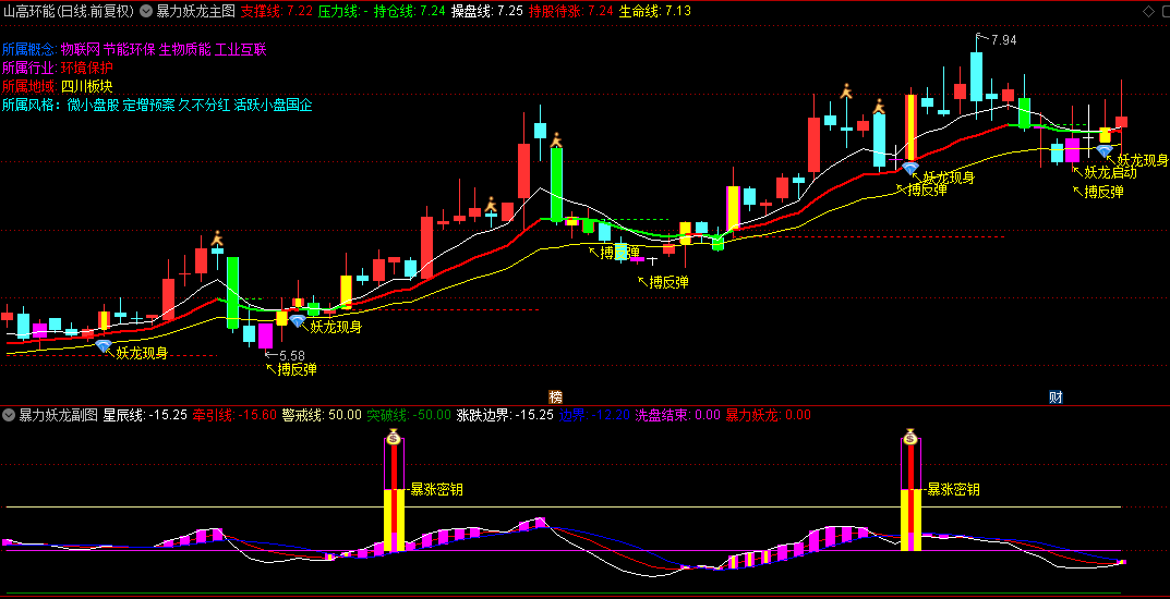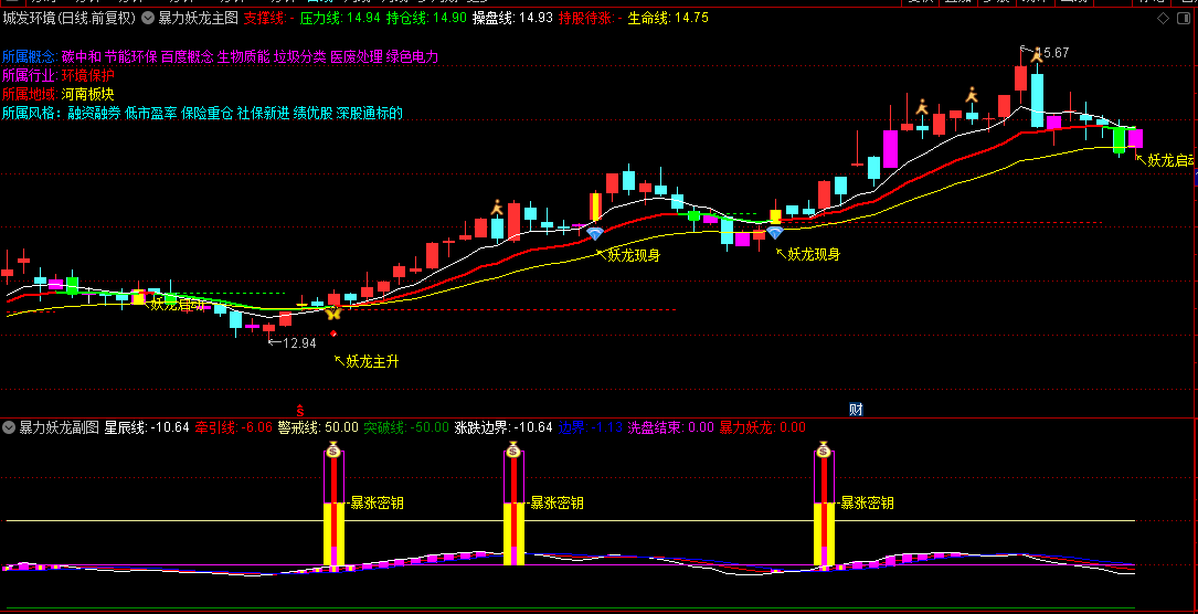 本指标为综合性分析工具,集主图、副图与选股功能于一体,适用于趋势跟踪和强势股捕捉。主图通过动态支撑压力线、妖龙启动/主升等提示信号,辅助判断买卖点与趋势强度。副图以星辰线与牵引线为核心,结合暴涨密钥等信号识别超跌反弹与突破机会。选股模块可快速筛选符合暴力妖龙条件的个股,聚焦量价异动的潜力品种。