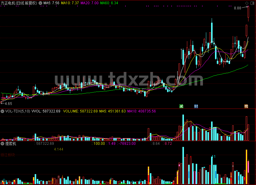 STICKLINE(梯量,VOL*9.1/10,VOL*8.5/10,1.1,0)COLORFF75FF;