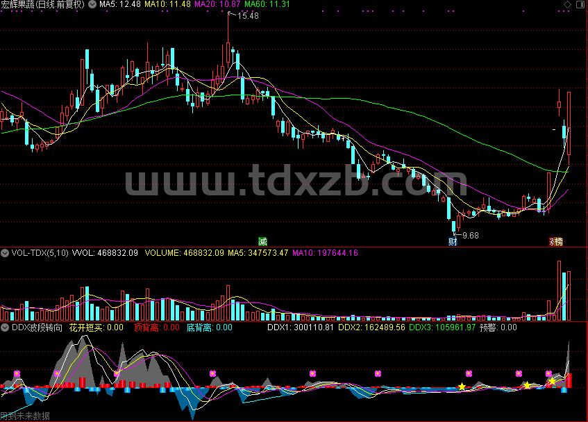 预警:DDX>0 AND MA(V,5)>MA(MA(V,5),5) AND CROSS(DDX1,DDX2),LINETHICK;