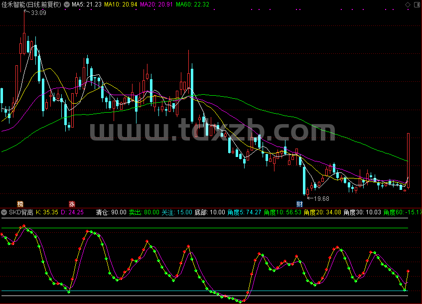 角度30:ATAN((MA30/REF(MA30,1)-1)*100)*180/3.1416 COLORWHITE NODRAW;