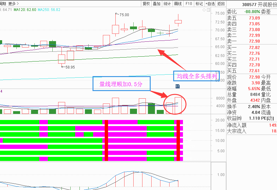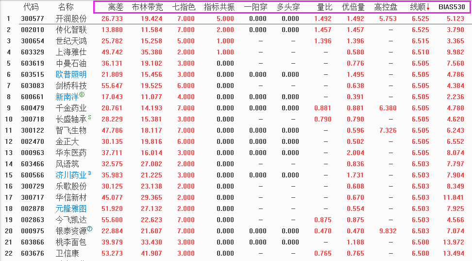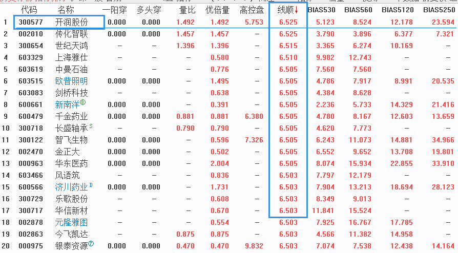 我们通过数字从大到小的排序,你可以很方便的看到那些股票趋势是走好的,呈现出大多头排列的格局,鼠标一点即可实现这种排列,如果你是个趋势交易者,每天大概也就翻看这里几十只股票即可,快速复盘!如我们本周排在第一个的叫开润股份,他的数值是6.525;个位数6,代表六线理顺,后面的十分位5,代表的是均量线5天均量线大于10天均量线,5天均量线大于60天均量线!后面还有百分位和千分位这里就不一一叙说,详细可看文章最后的视频说明!