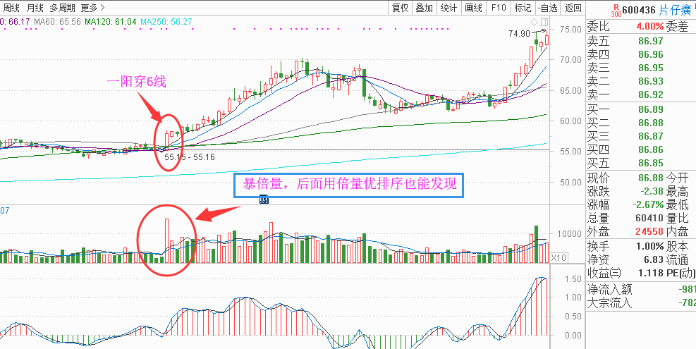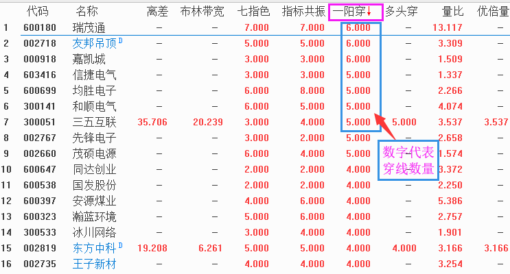 比方说有些朋友喜欢找一阳穿三线,一阳穿四线,或者一阳穿五线的股票,那通过我们这种排序的方法,你只需要轻点击一下鼠标,他会从大到小有次序的排列,可能你想找一阳穿三线的股票,结果这么排序,还发现一些一阳穿六线的股票貌似更好。。。