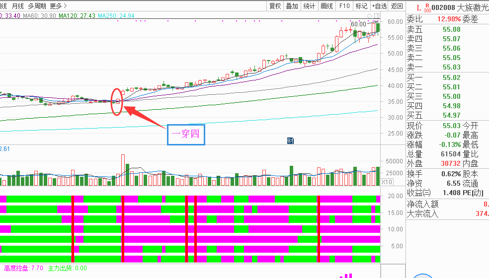 在一阳穿旁边还提供了一个多头穿,这里提一下所谓的多头穿,本排序中大量使用,所谓的多头,就是指的5、10、20、60、120、250这6条均线中,60、120、250这三条线,至少有2条要排在最下方!至于是哪两条,这个不管!其实意思就是要这些中长期均线大致要走好!