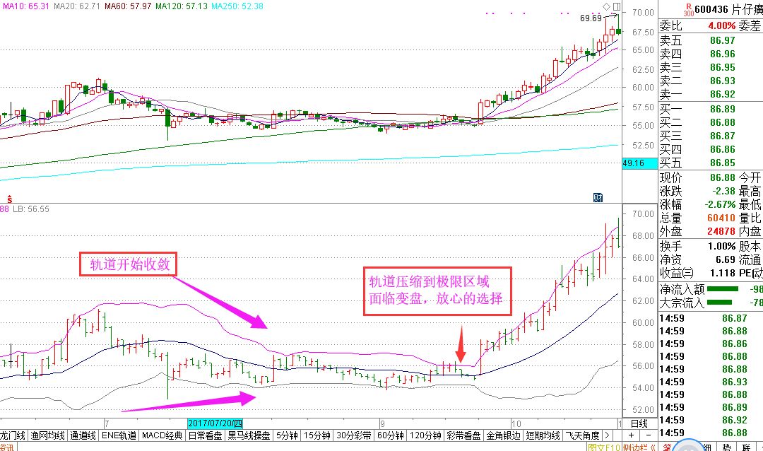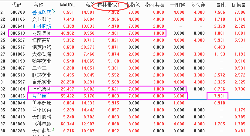 可以看到无论是丽珠集团还是上汽集团,还是片仔癀,他们当时的boll带宽在4-5点左右,这代表的是布林的上下轨道之间只相差5%的距离,一根中阳线即可实现从下轨道穿到上轨道去,我一般都喜欢把布林上下轨道这间相差6%的股票看一下,越小越好,而且最好有一个维持区间,也就说轨道保持这种小口径的状态1-2周尤佳!